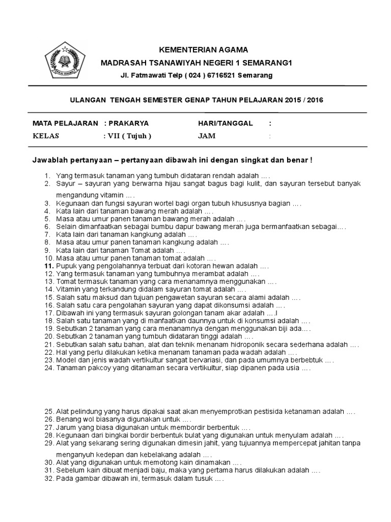 .penilaian tengah semester (pts) semester 2 akan segera dilaksanakan khusus untuk mata pelajaran pai maka dari itu sangat penting bagi adik adik atau siapa saja yang berafiliasi dengan pendidikan sekolah biar segera sanggup memprediksi materi bahan apa saja yang mesti. Contoh soal pg prakarya kelas 8 semester 1 beserta jawaban kurikulum 2013 smp.docx. Kurikulum acuan tahun pelajaran bentuk soal alokasi waktu. Laporkan kepada pengawas apaila terdapat tulisan yang kurang jelas, rusak maupun jumlah soal. Contoh soal prakarya kelas 7 semester 2 ini sudah dilengkapi beserta kunci jawaban.